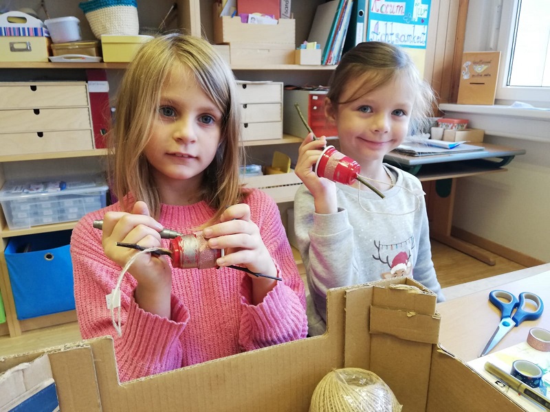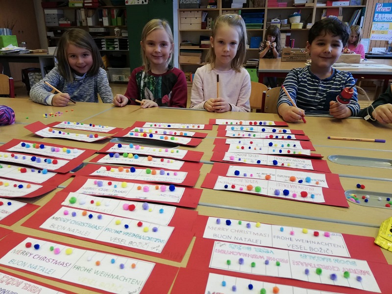 Gebastelt wurde mit der Lehrerin Maria Oraže-Kert. Die Kinder bastelten bunte Kärtchen mit viersprachigen Weihnachtsgrüßen. Auch ein kleines Vogelrestaurant wurde gestaltet und befüllt. Denn zu Weihnachten verdienen sich auch unsere Vögel ein besonderes Menü.